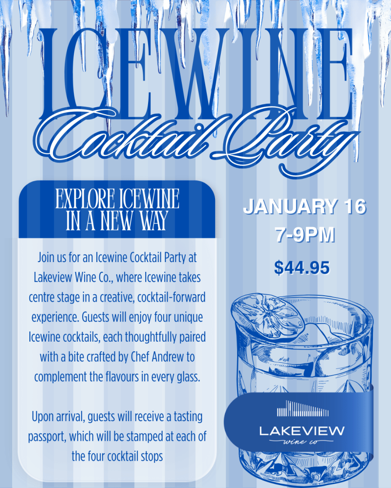 Join us for an Icewine Cocktail Party at Lakeview Wine Co., where Icewine takes centre stage in a creative, cocktail-forward experience. Guests will enjoy four unique Icewine cocktails, each thoughtfully paired with a bite crafted by Chef Andrew to complement the flavours in every glass.